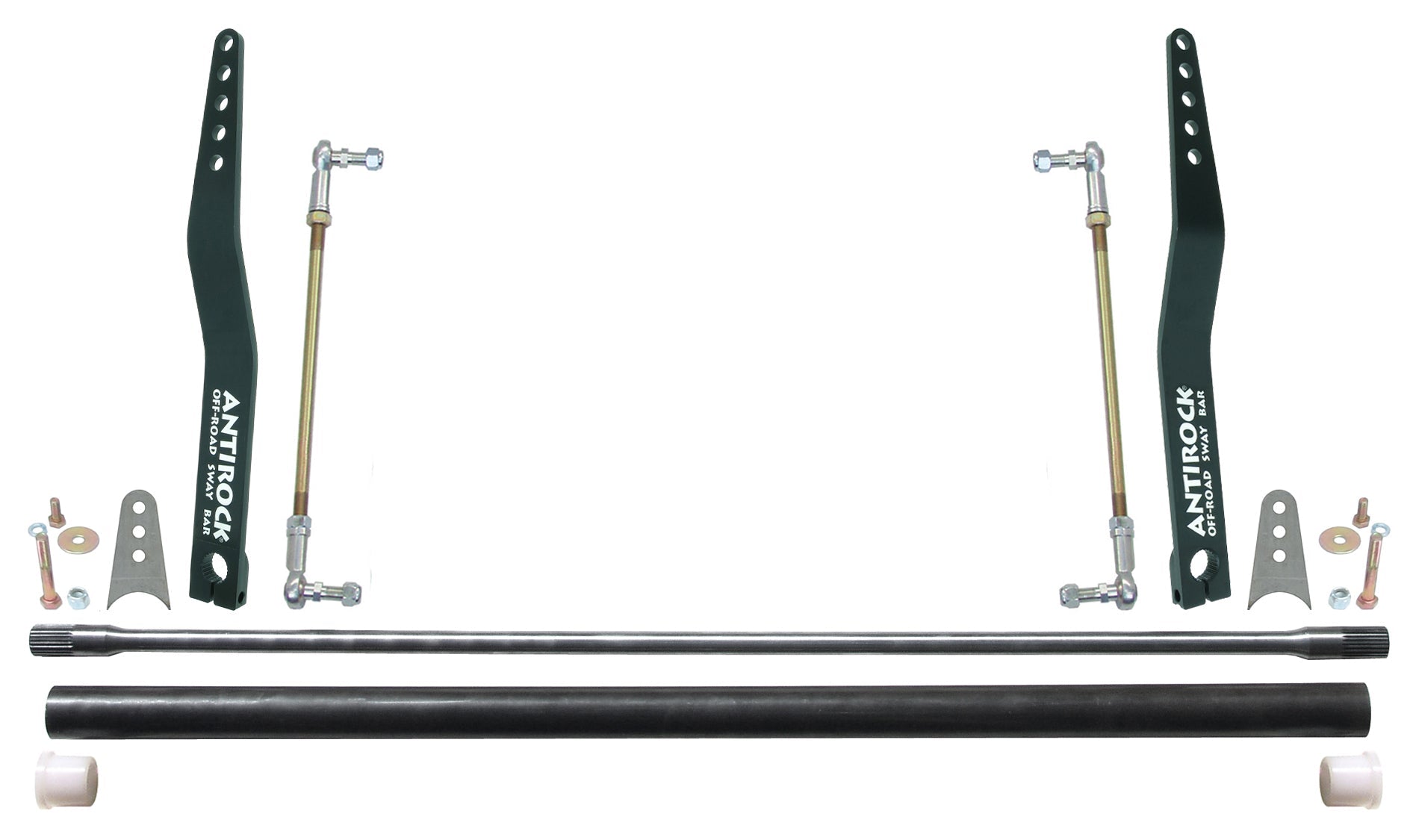 RockJock's Antirock sway bar kits are available in a universal fit configuration for those building their own custom rigs and rock buggies. This universal kit features a 32 in. torsion bar length and bent 20 in. long fabricated steel arms. Vertical links use a 14 in. long 1/2 in. x .20 RH/LH threaded rod that can be cut down to your desired length, and the necessary 1/2 in. x 20 thread heim joint rod ends, jam nuts, and tabs to weld to your axle tube are supplied. Also supplied is the universal weld-in 1.75 in. x .095 wall DOM tube that is cut to the proper length to work with the torsion bar length, and the delrin bushings to support the bar in the tube. The 32 in. bar is a .700 in. diameter. These kits require fabricating for installation -- these are NOT bolt-on kits.